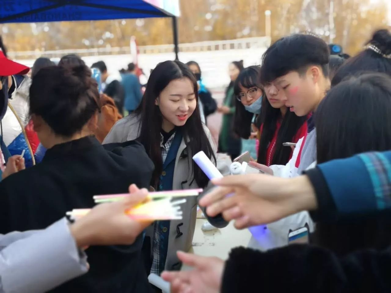 秋風(fēng)蕭瑟中,同學(xué)們?cè)缭绲牡竭_(dá)了活動(dòng)現(xiàn)場(chǎng),簽名墻合影留念。